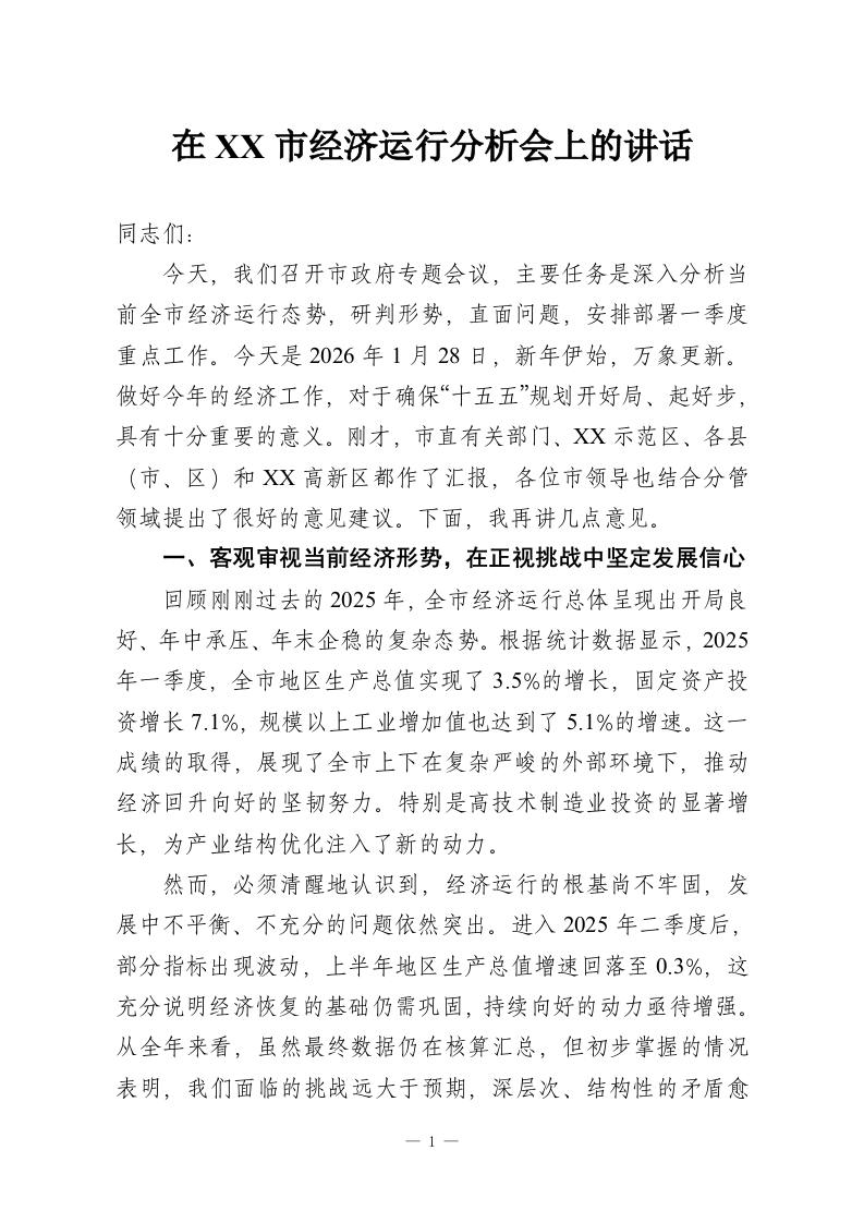 在XX市经济运行分析会上的讲话