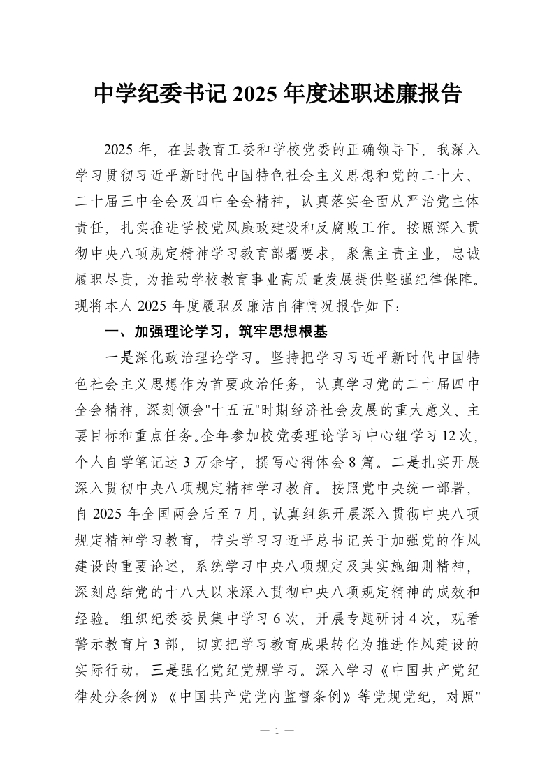 首页讲课讲稿中学纪委书记2025年度述职述廉报告