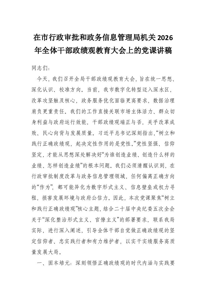 在市行政审批和政务信息管理局机关2026年全体干部政绩观教育大会上的党课讲稿