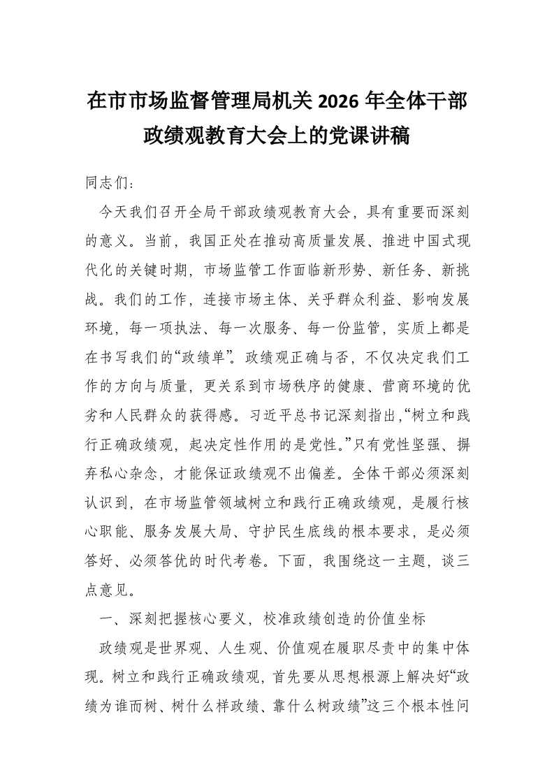 首页写作素材在市市场监督管理局机关2026年全体干部政绩观教育大会上的党课讲稿