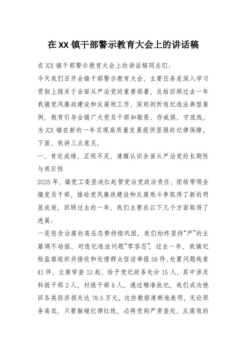 在XX镇干部警示教育大会上的讲话稿