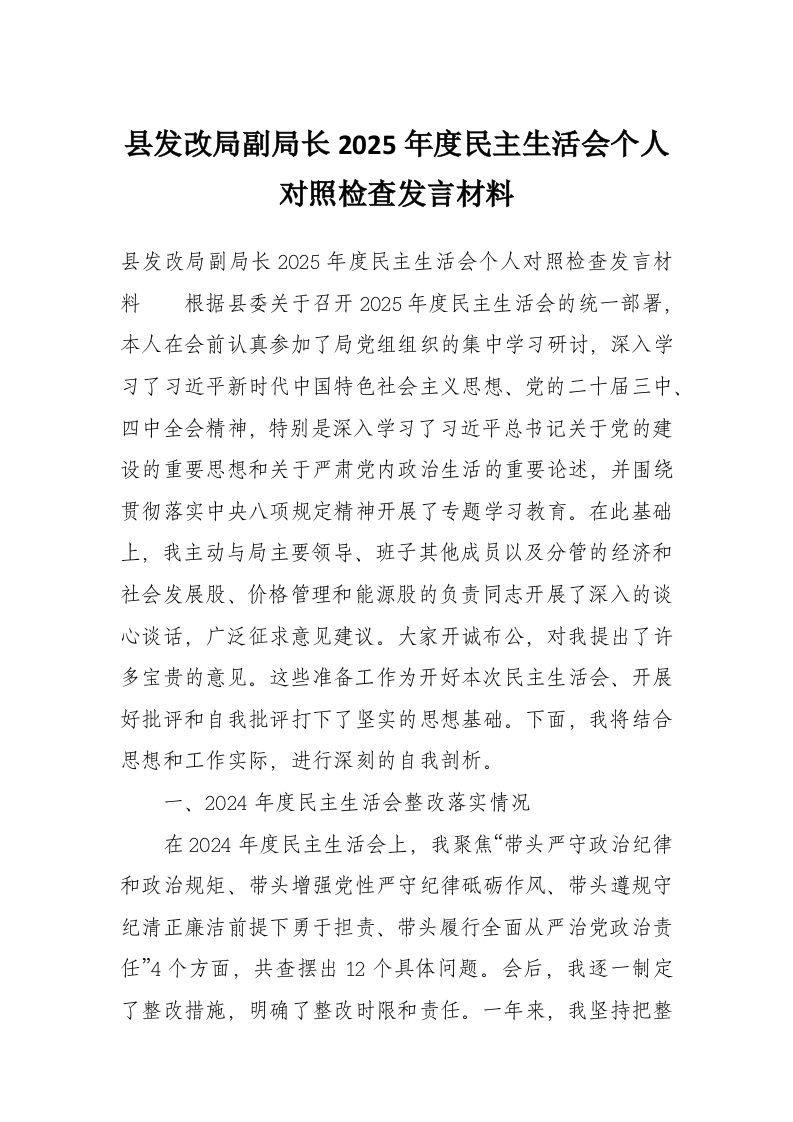 县发改局副局长2025年度民主生活会个人对照检查发言材料