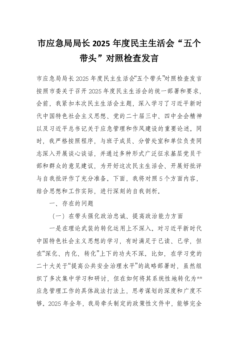 首页写作素材市应急局局长2025年度民主生活会“五个带头”对照检查发言