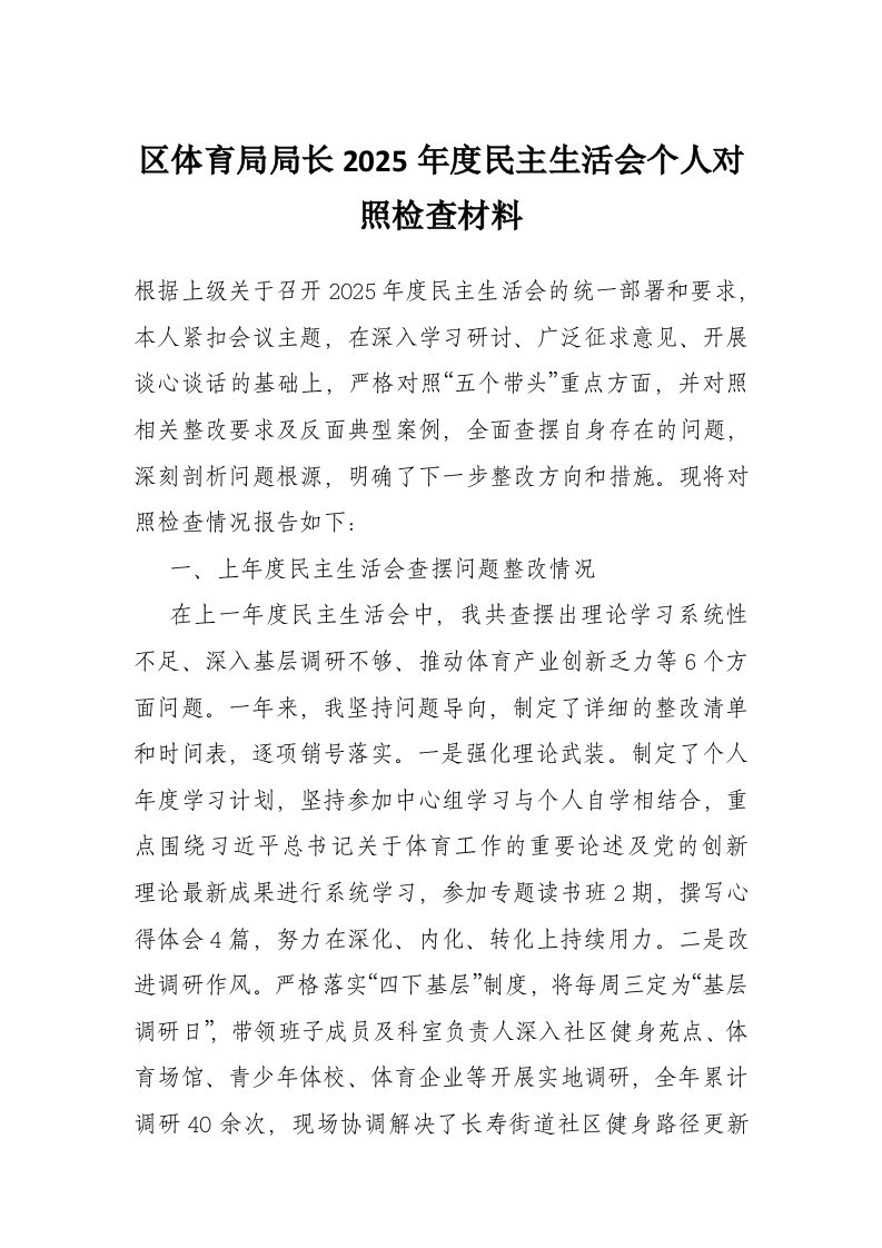 首页写作素材区体育局局长2025年度民主生活会个人对照检查材料