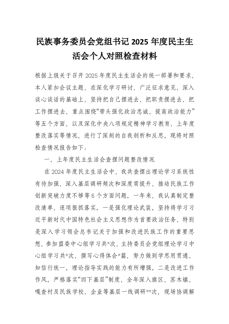 首页写作素材民族事务委员会党组书记2025年度民主生活会个人对照检查材料
