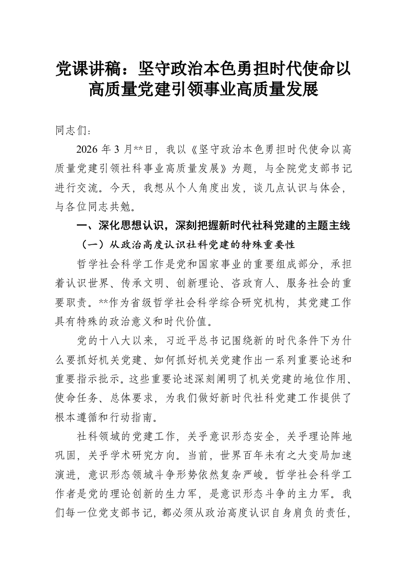 首页精选范文党课讲稿:坚守政治本色勇担时代使命以高质量党建引领事业高质量发展