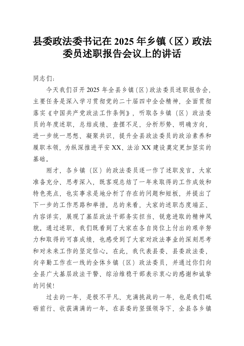 首页精选范文县委政法委书记在2025年乡镇(区)政法委员述职报告会议上的讲话