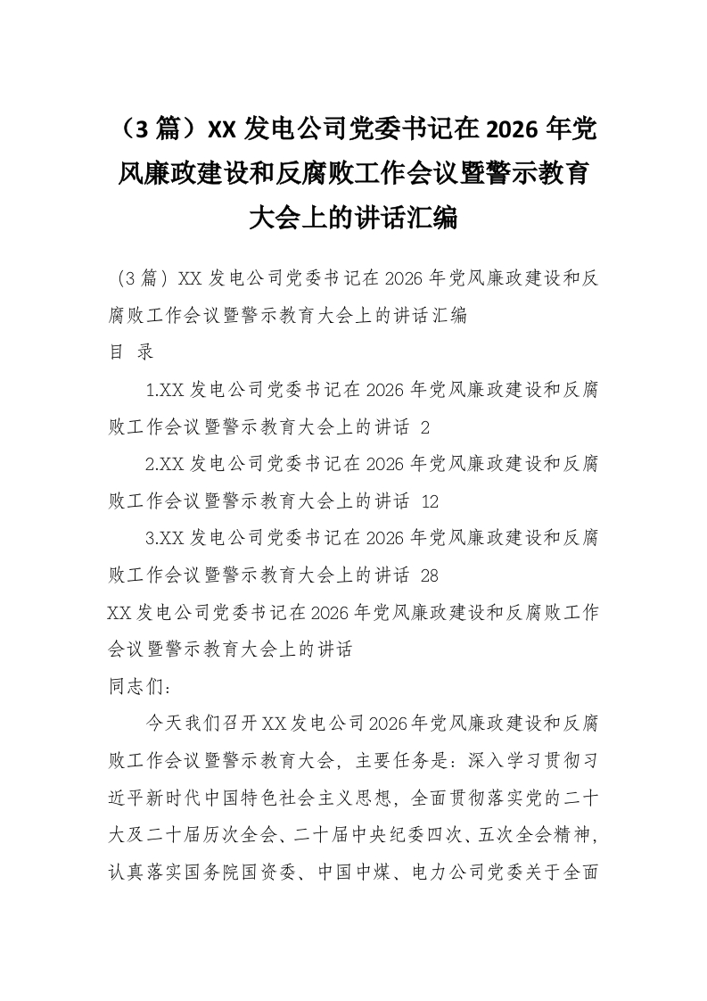 (3篇)XX发电公司党委书记在2026年党风廉政建设和反腐败工作会议暨警示教育大会上的讲话汇编