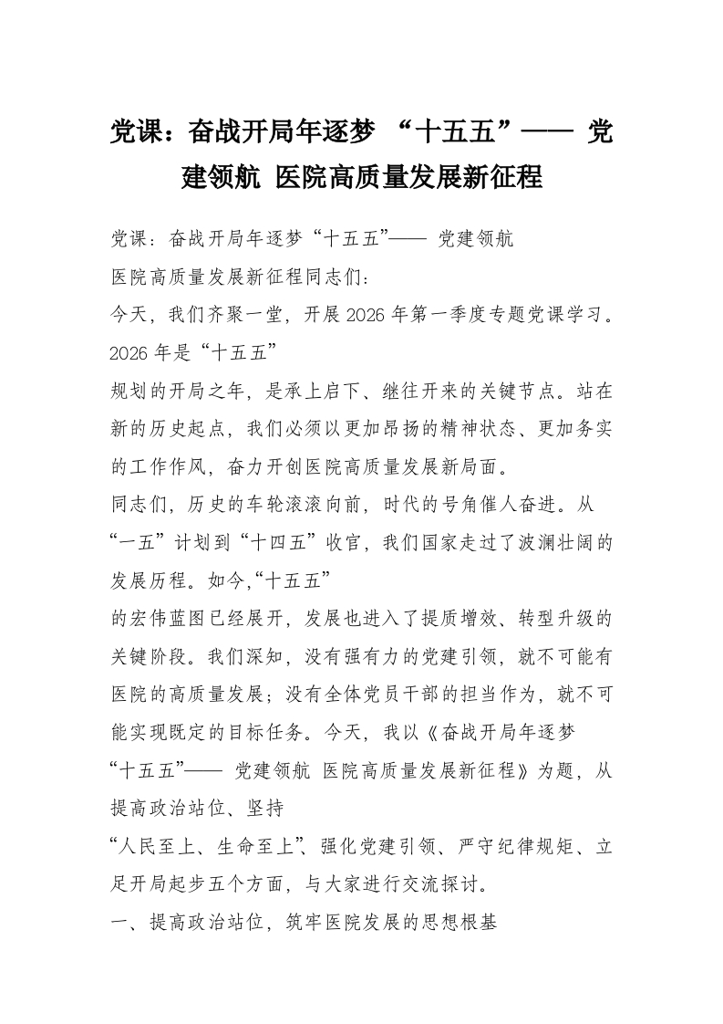 党课:奋战开局年逐梦 “十五五”—— 党建领航 医院高质量发展新征程