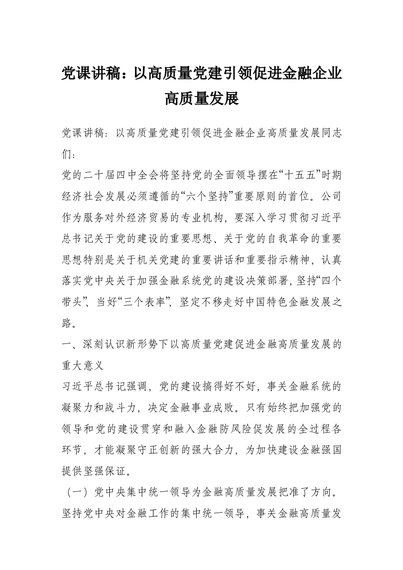 党课讲稿:以高质量党建引领促进金融企业高质量发展