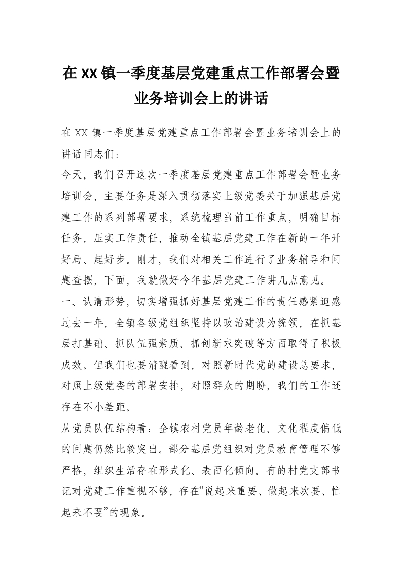 在XX镇一季度基层党建重点工作部署会暨业务培训会上的讲话
