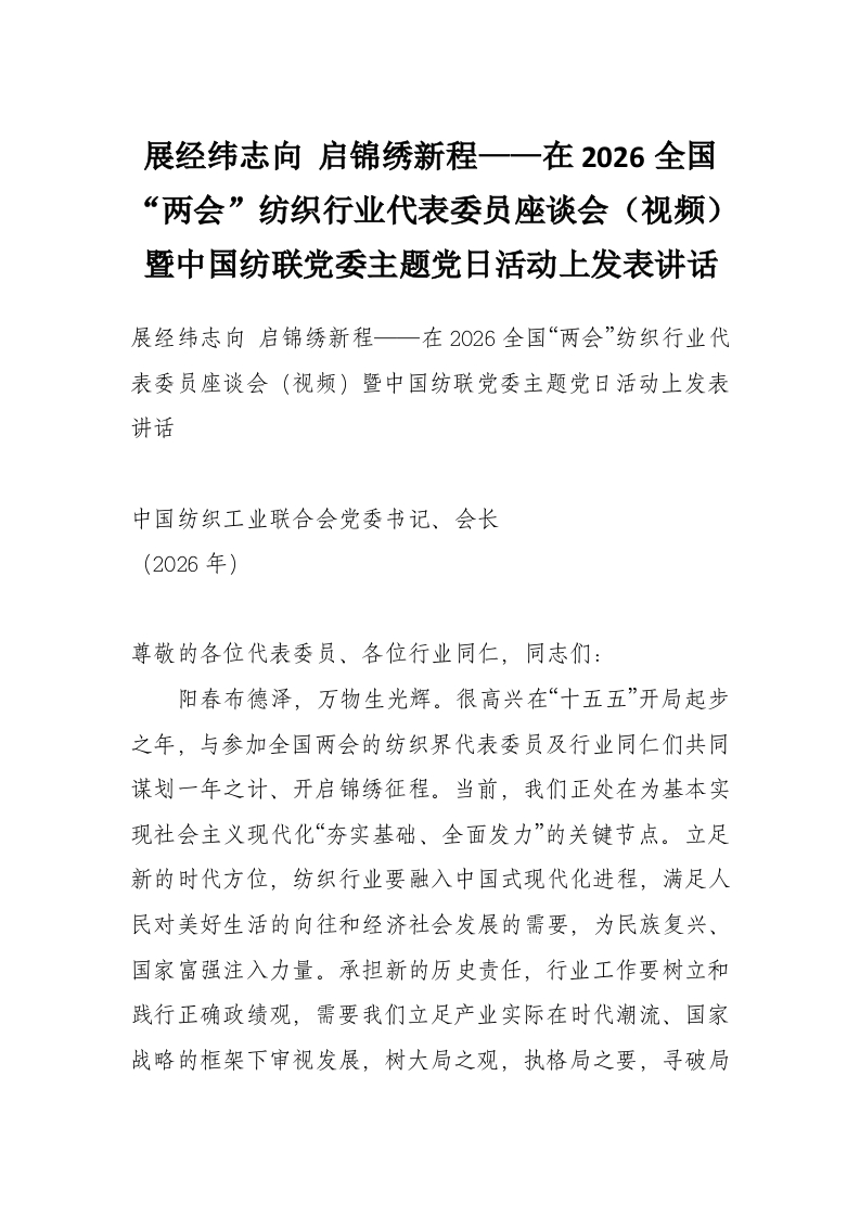 展经纬志向 启锦绣新程——在2026全国“两会”纺织行业代表委员座谈会(视频)暨中国纺联党委主题党日活动上发表讲话