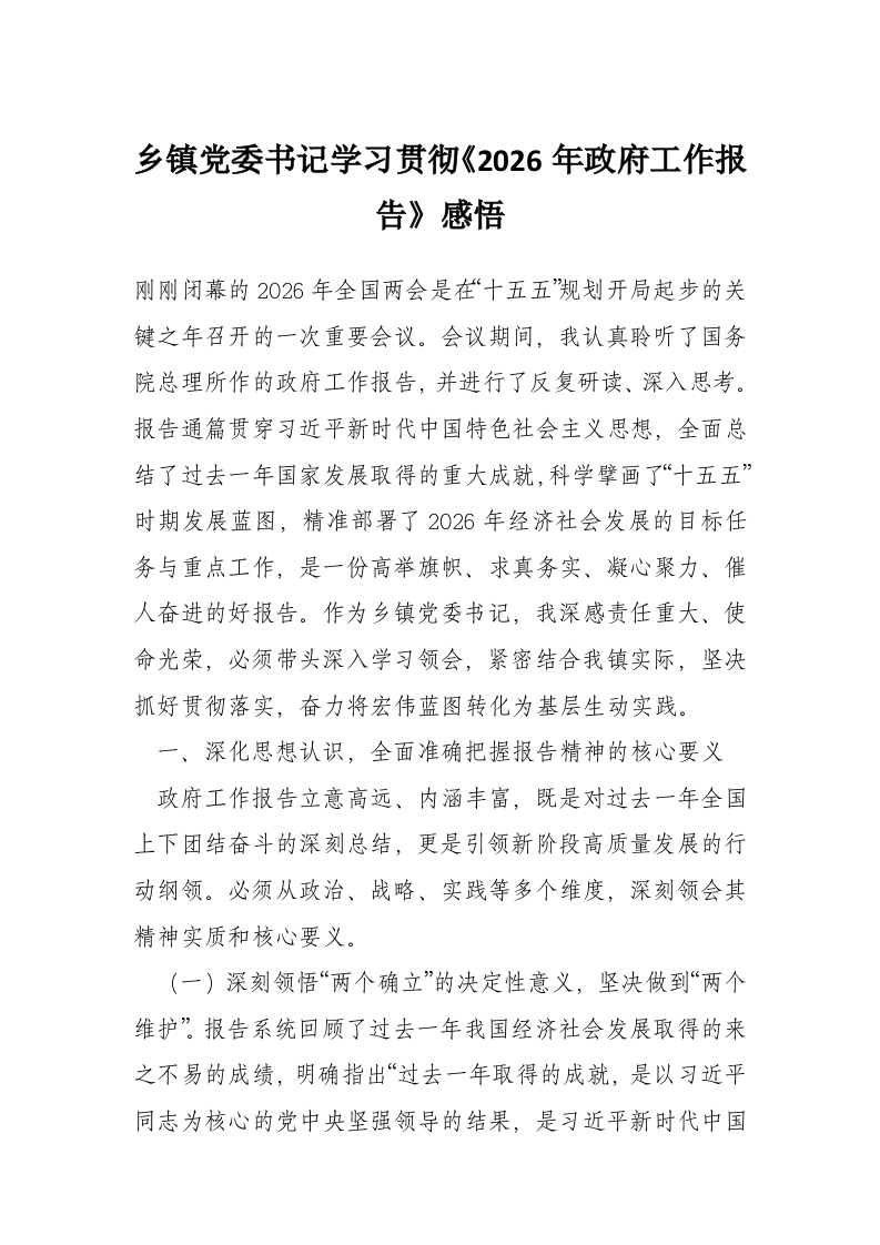 乡镇党委书记学习贯彻《2026年***工作报告》感悟