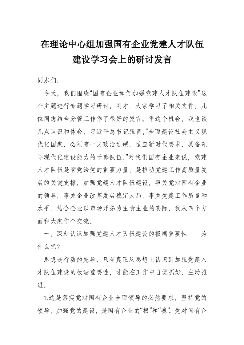 在理论中心组加强国有企业党建人才队伍建设学习会上的研讨发言