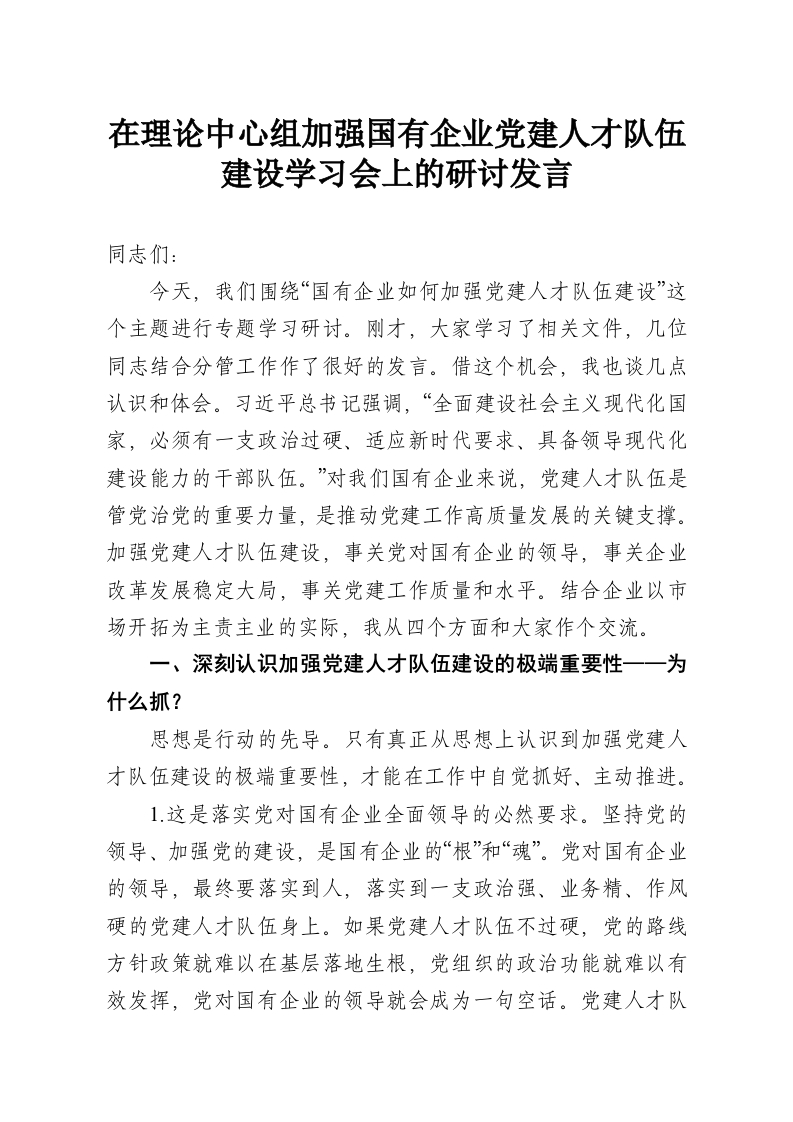 在理论中心组加强国有企业党建人才队伍建设学习会上的研讨发言