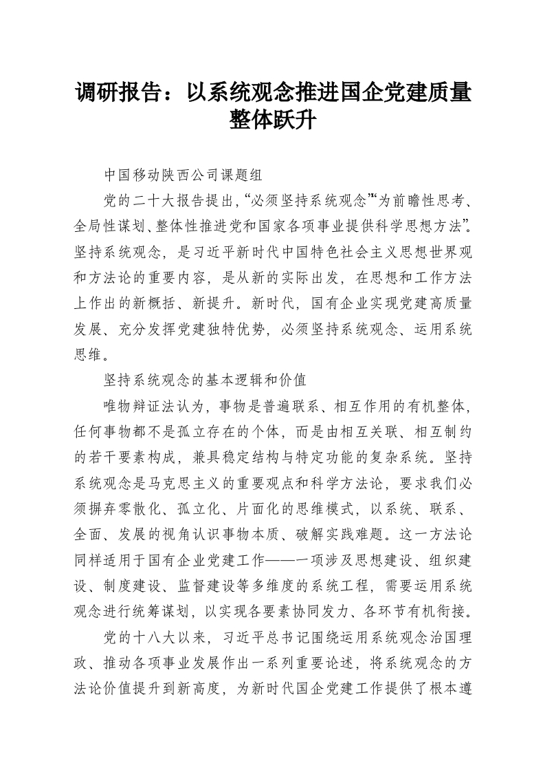 首页工作文档调研报告:以系统观念推进国企党建质量整体跃升