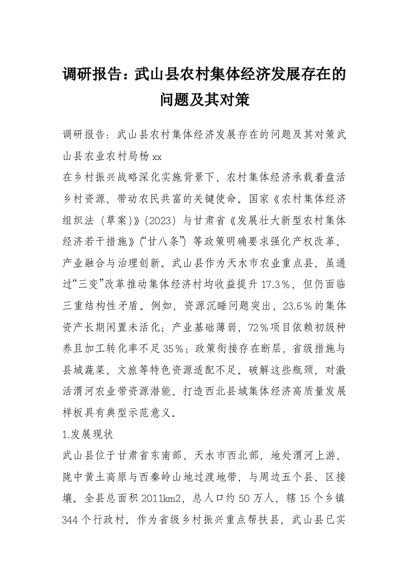 调研报告:武山县农村集体经济发展存在的问题及其对策