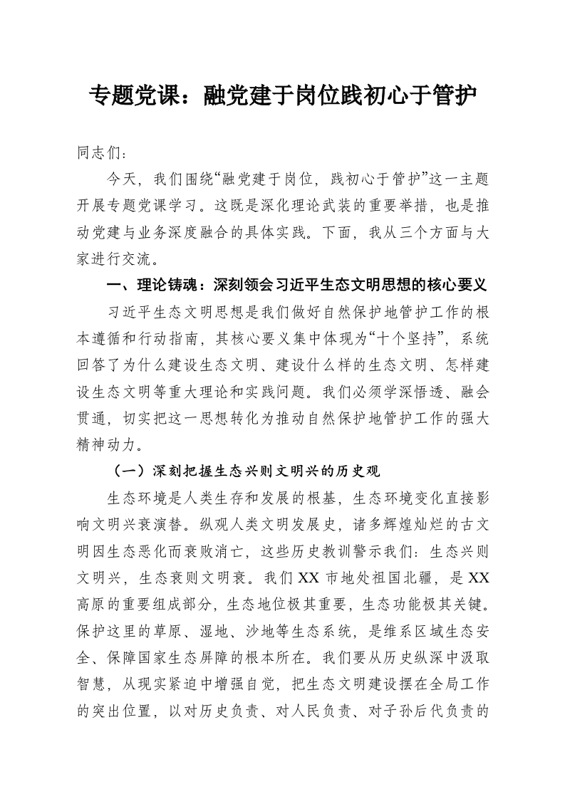 首页讲课讲稿专题党课:融党建于岗位践初心于管护