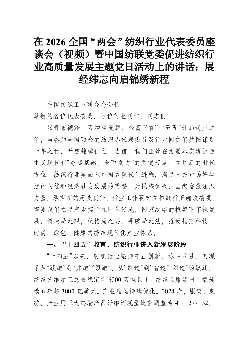 在2026全国“两会”纺织行业代表委员座谈会(视频)暨中国纺联党委促进纺织行业高质量发展主题党日活动上的讲话:展经纬志向启锦绣新程