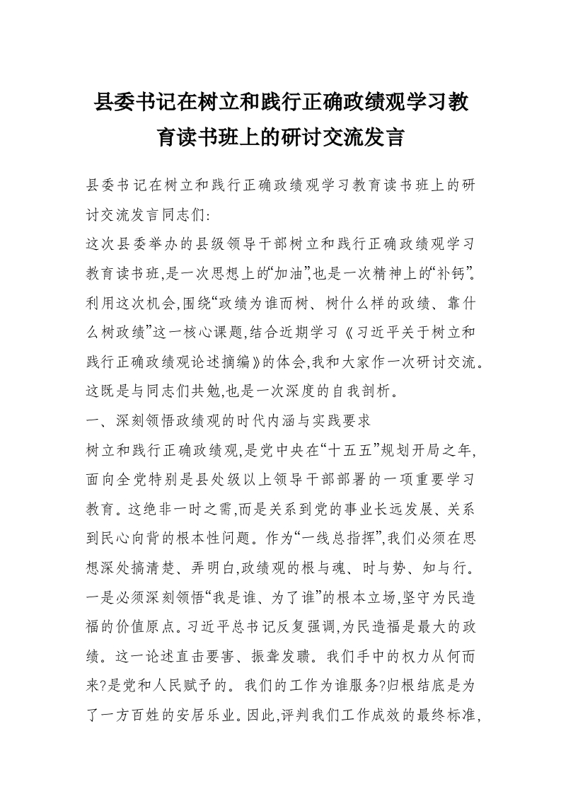 首页精选范文县委书记在树立和践行正确政绩观学习教育读书班上的研讨交流发言