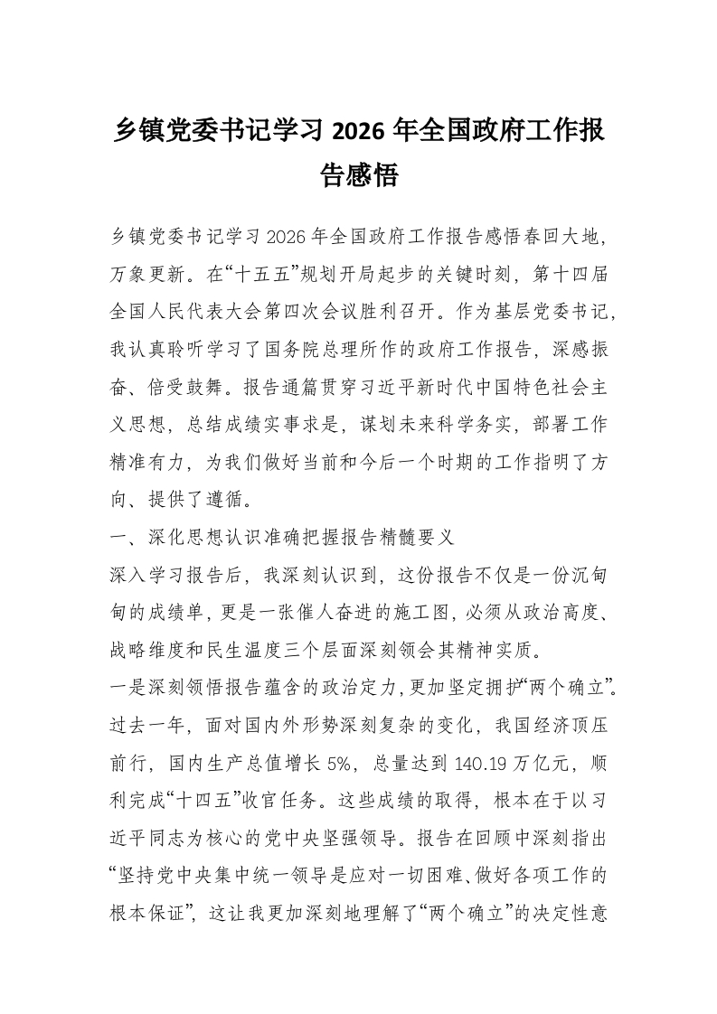 乡镇党委书记学习2026年全国***工作报告感悟