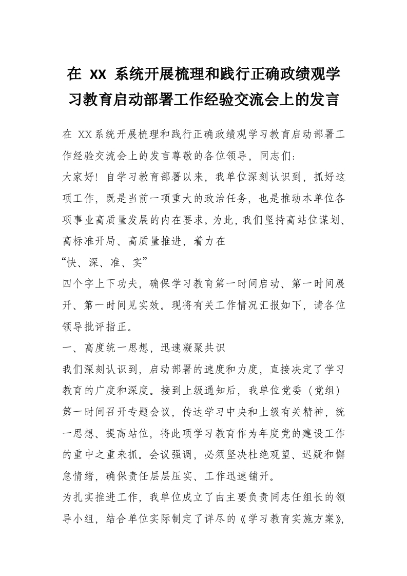 在 XX 系统开展梳理和践行正确政绩观学习教育启动部署工作经验交流会上的发言