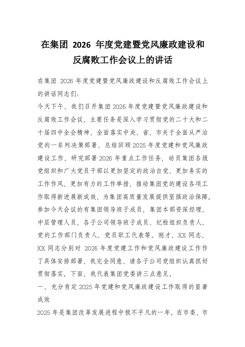 在集团 2026 年度党建暨党风廉政建设和反腐败工作会议上的讲话