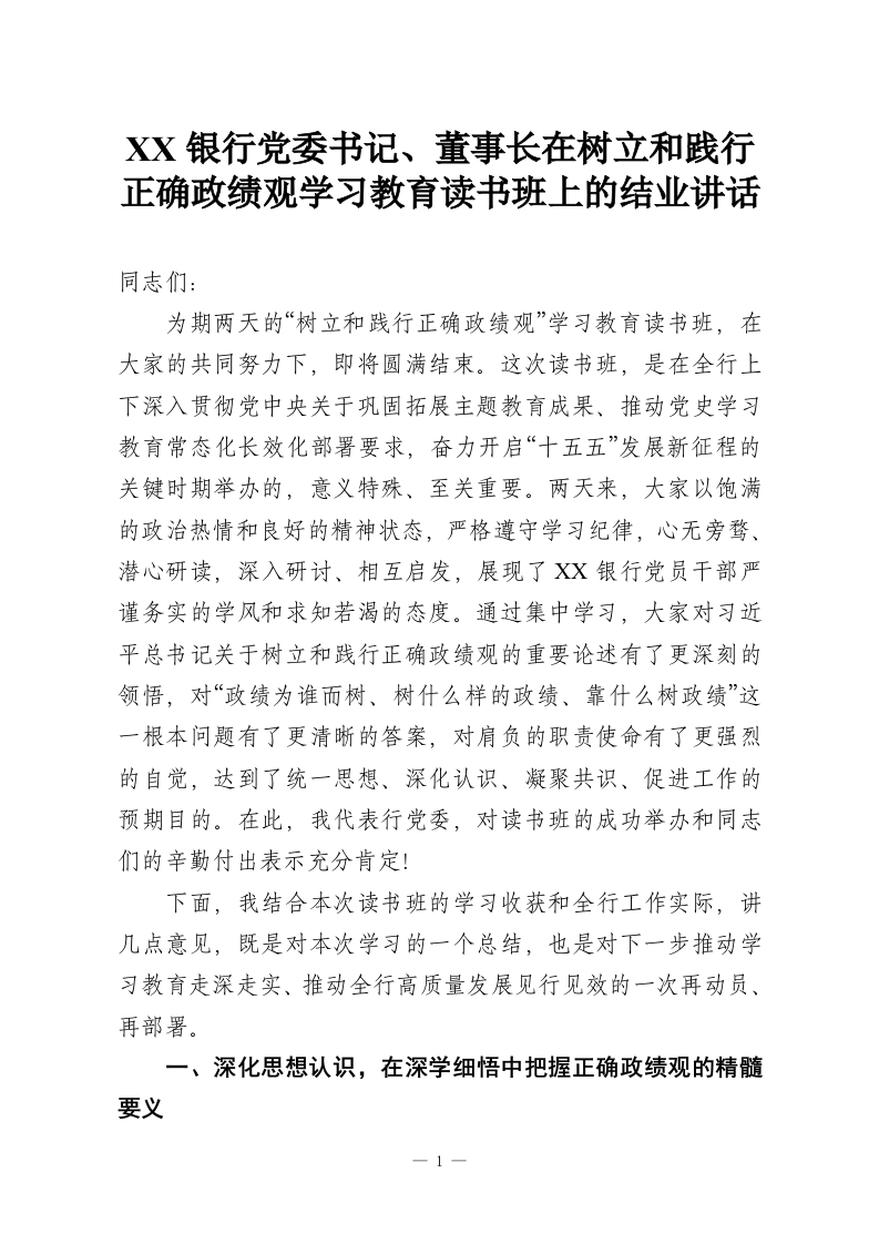 XX银行党委书记、董事长在树立和践行正确政绩观学习教育读书班上的结业讲话