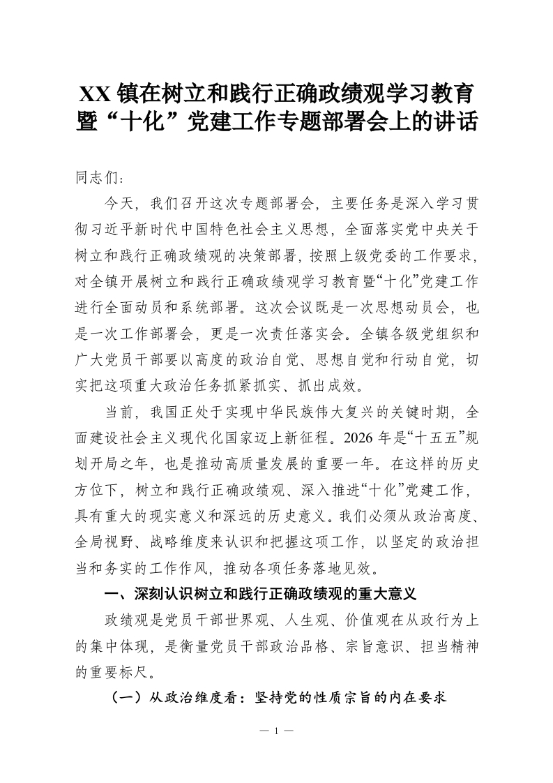 XX镇在树立和践行正确政绩观学习教育暨“十化”党建工作专题部署会上的讲话