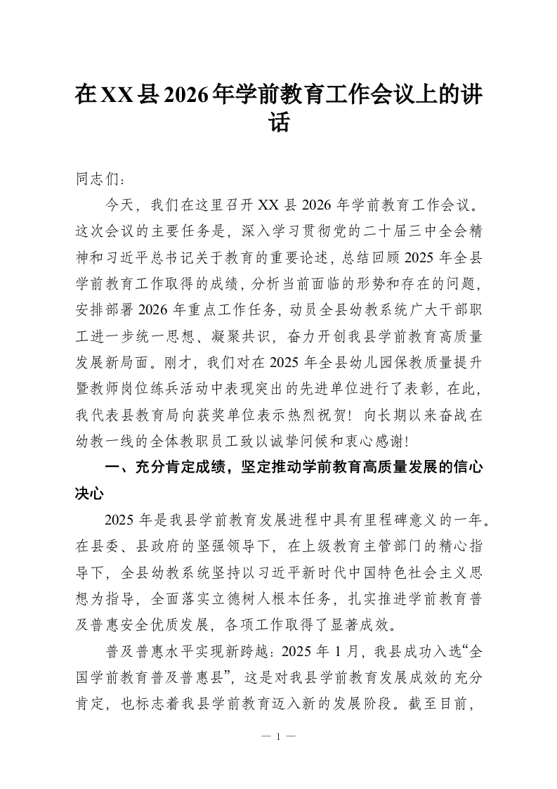首页工作文档在XX县2026年学前教育工作会议上的讲话