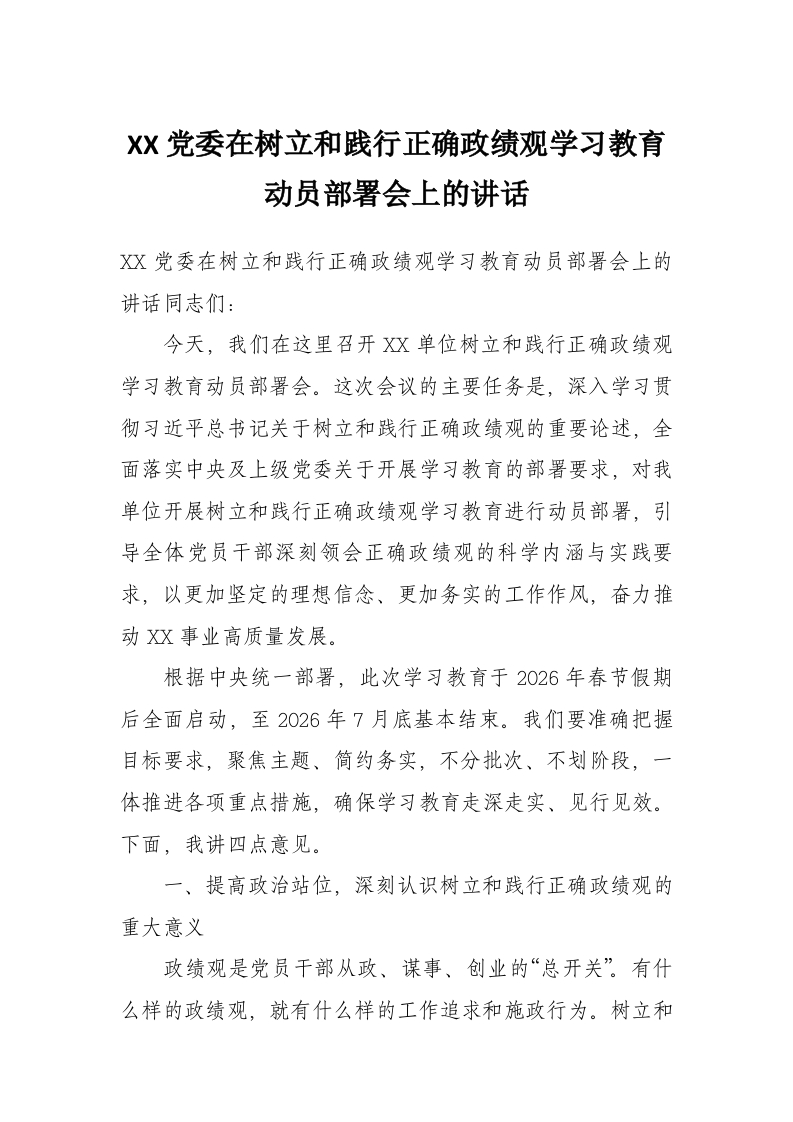 XX党委在树立和践行正确政绩观学习教育动员部署会上的讲话