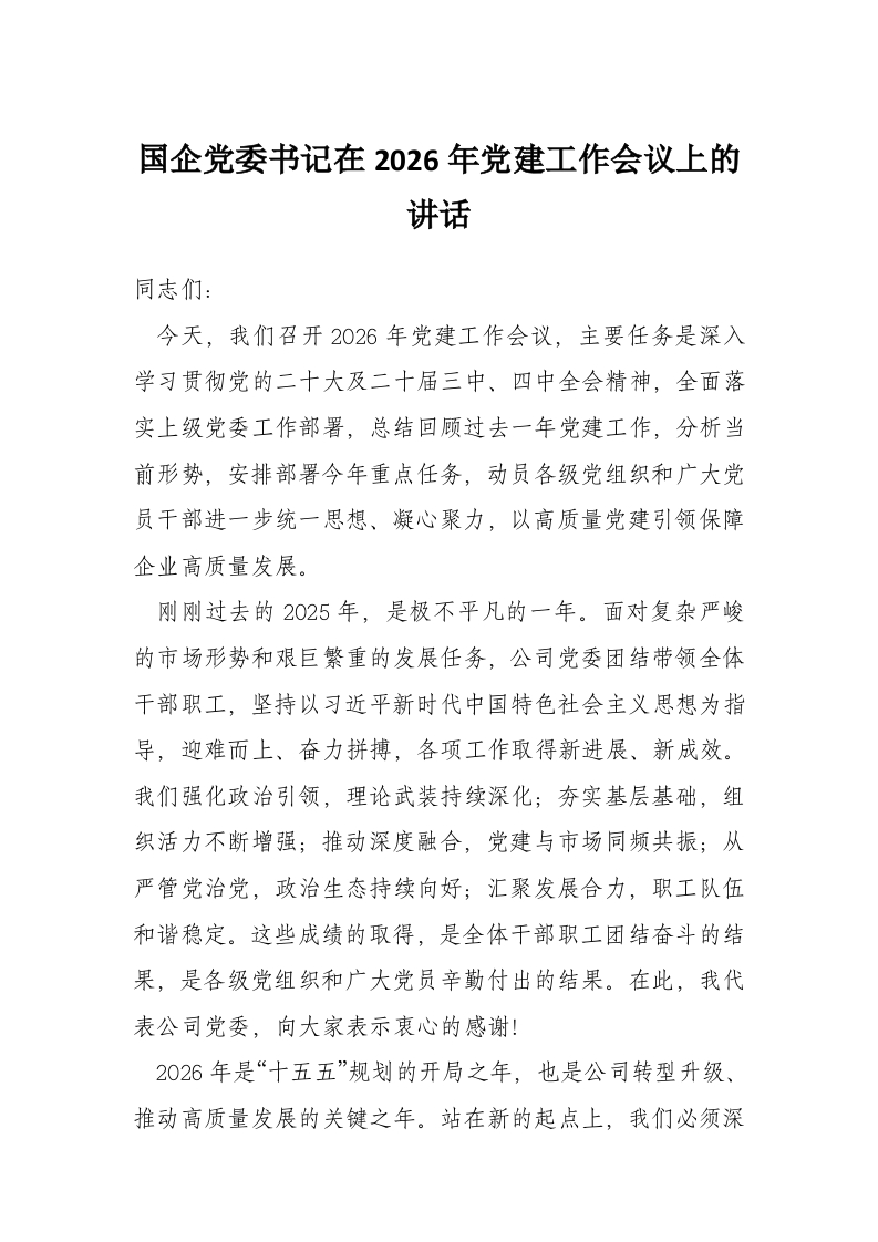 国企党委书记在2026年党建工作会议上的讲话