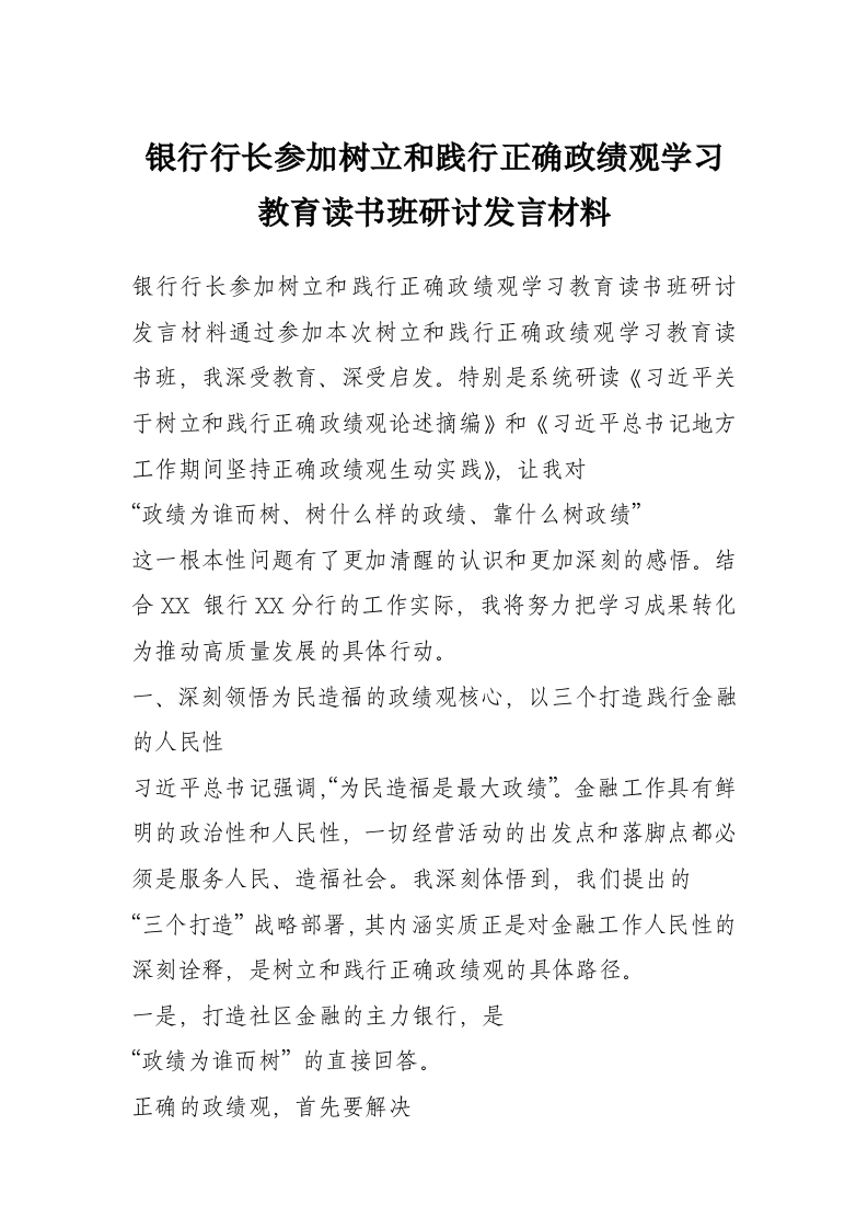 银行行长参加树立和践行正确政绩观学习教育读书班研讨发言材料