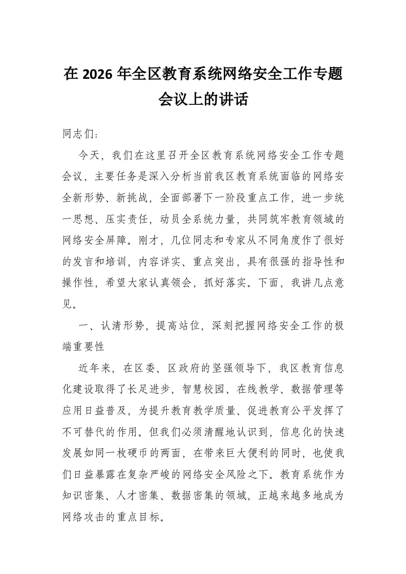 在2026年全区教育系统网络安全工作专题会议上的讲话
