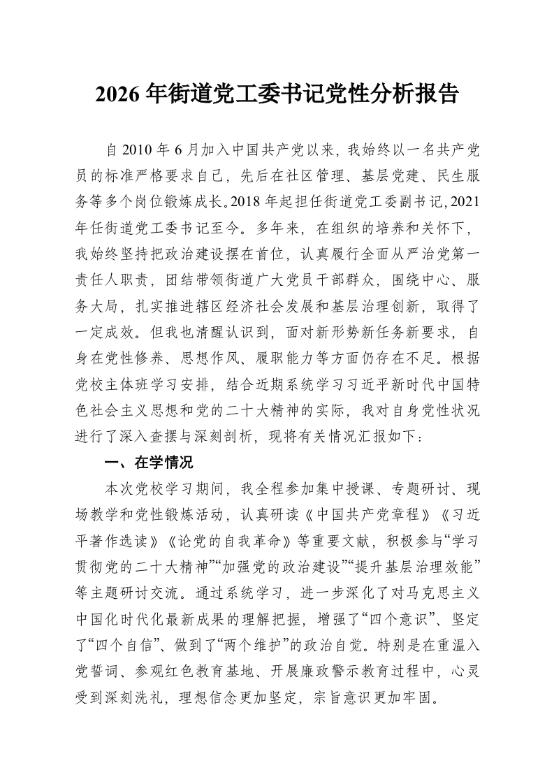 首页工作文档2026年街道党工委书记党性分析报告