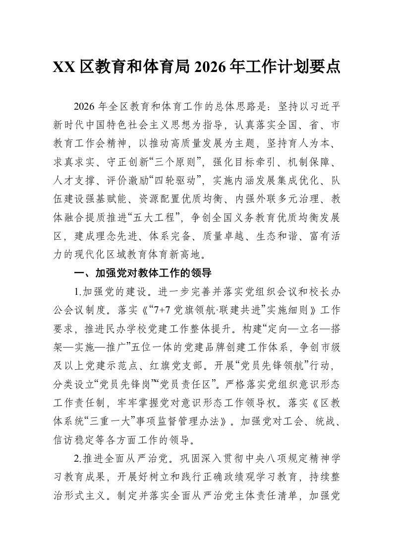 XX区教育和体育局2026年工作计划要点