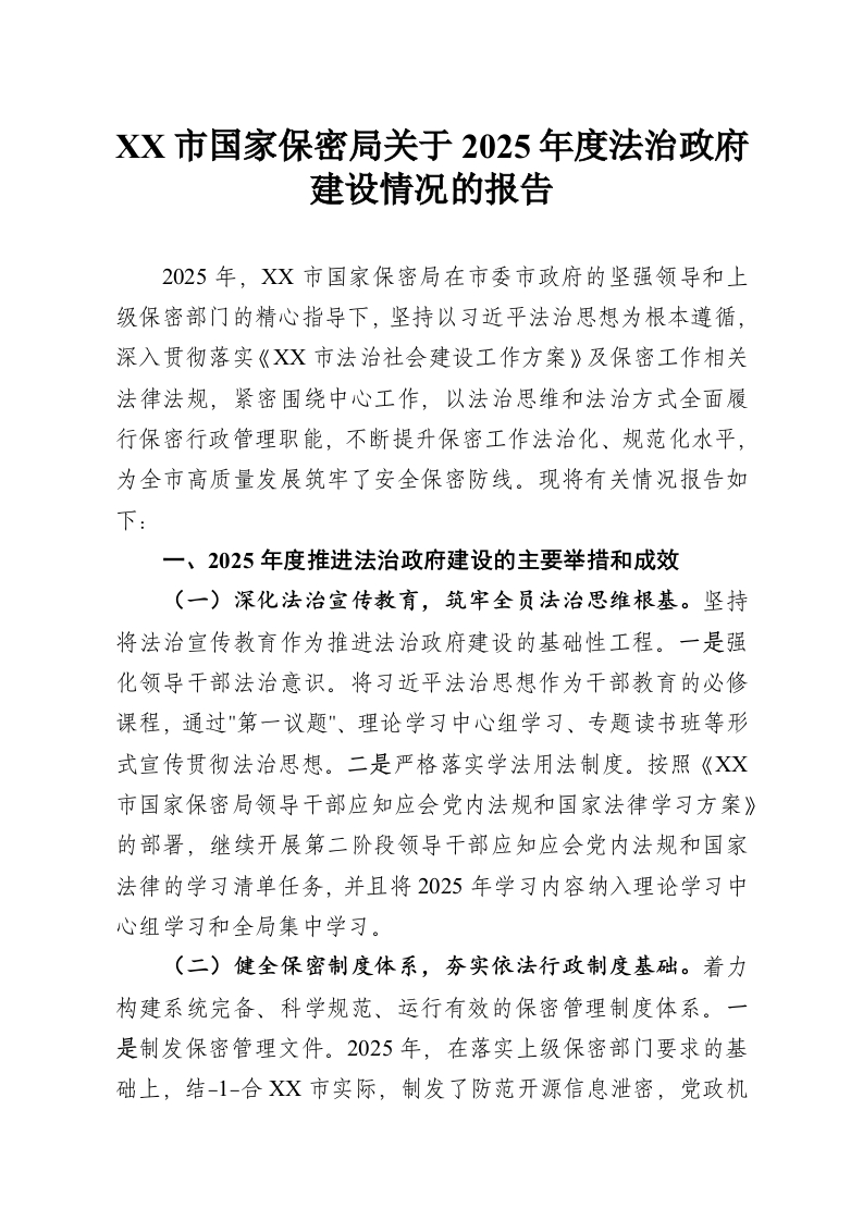 首页工作文档XX市国家保密局关于2025年度法治***建设情况的报告