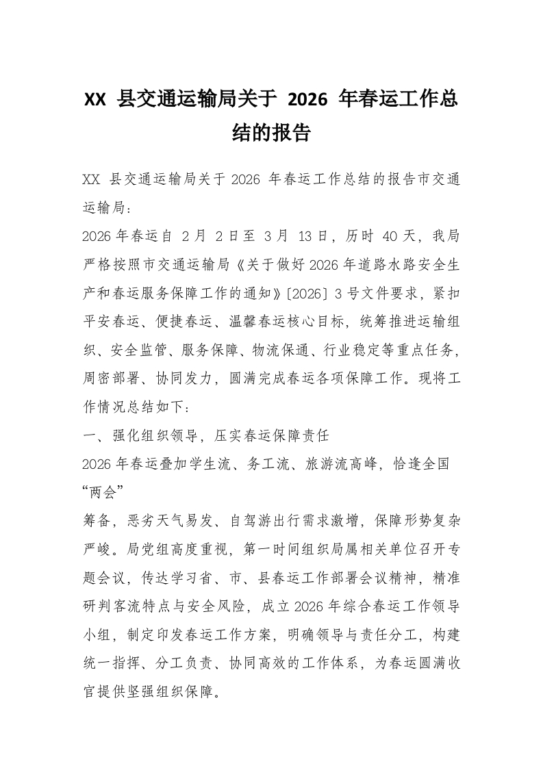 首页工作文档XX 县交通运输局关于 2026 年春运工作总结的报告