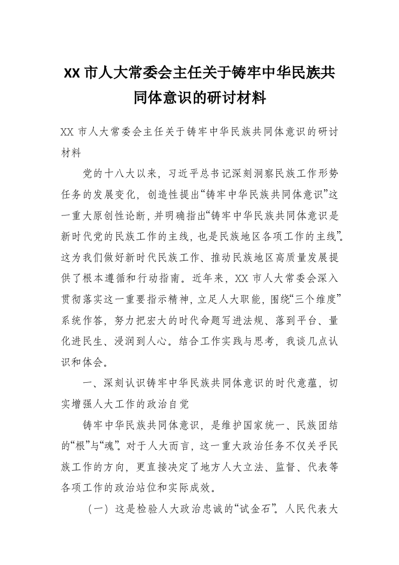 XX市人大常委会主任关于铸牢中华民族共同体意识的研讨材料