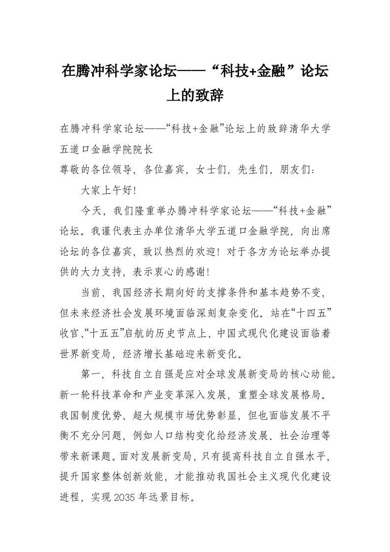 在腾冲科学家论坛——“科技+金融”论坛上的致辞