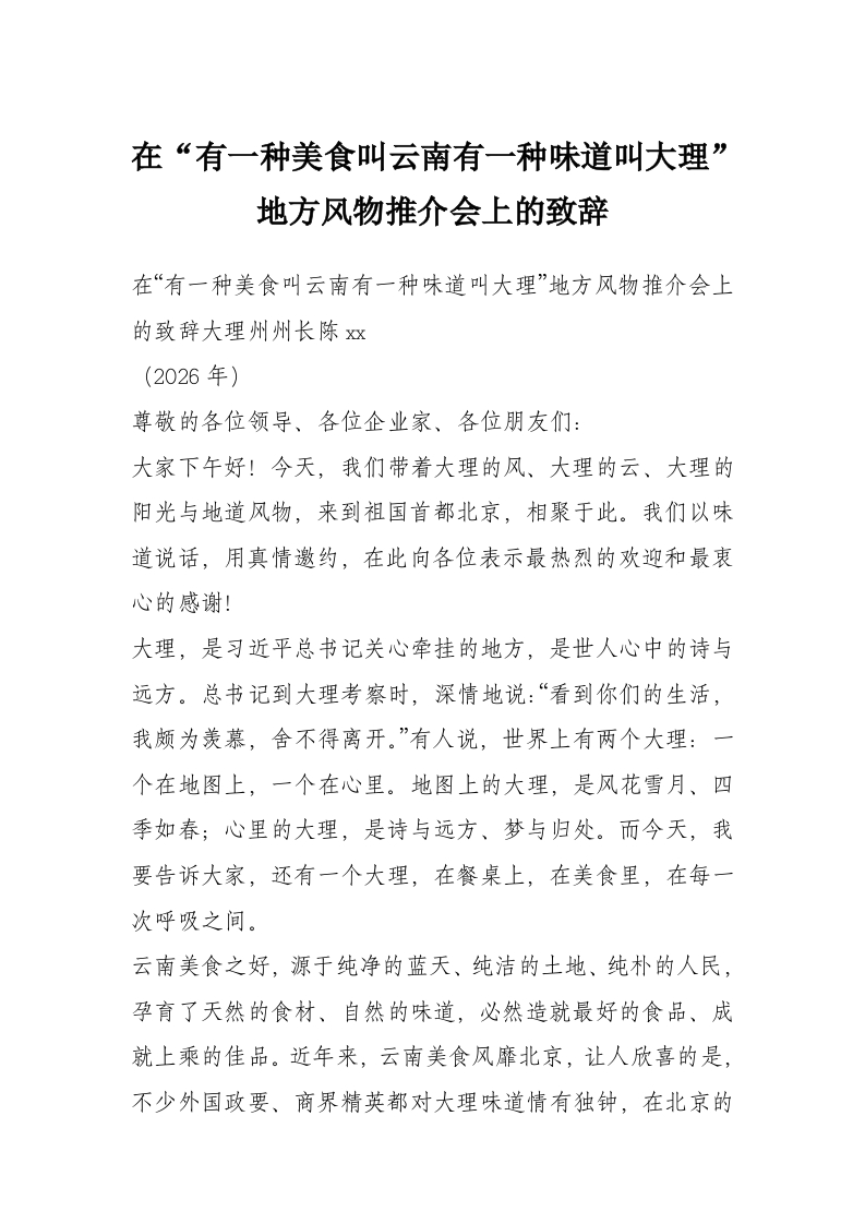 首页精选范文在“有一种美食叫云南有一种味道叫大理”地方风物推介会上的致辞