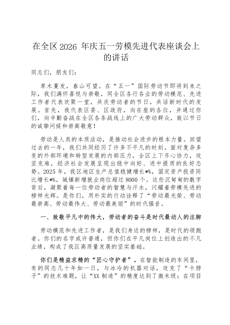 - 在2026年庆五一劳模先进代表座谈会上的讲话