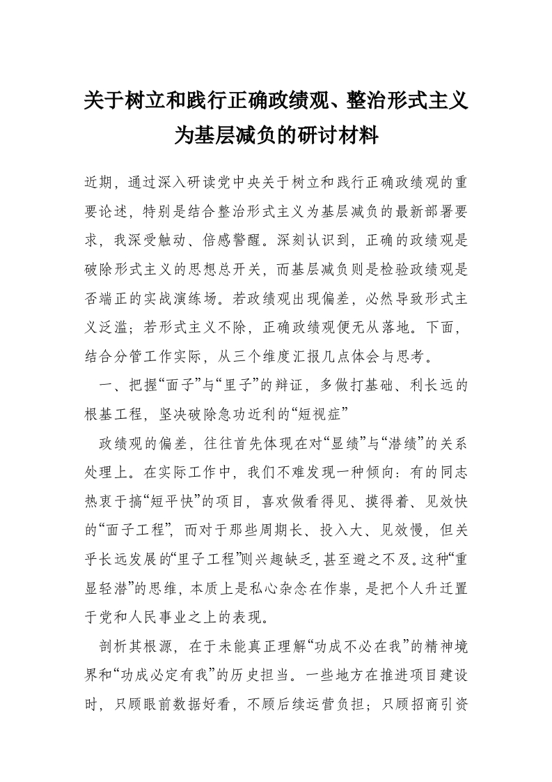 关于树立和践行正确政绩观、整治形式主义为基层减负的研讨材料