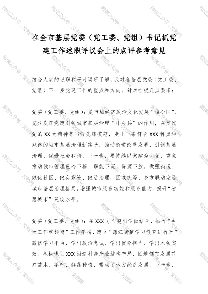 在全市基层党委(党工委、党组)书记抓党建工作述职评议会上的点评参考意见